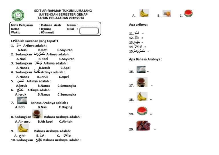 Berbicara mengenai kosakata bahasa arab memang sangatlah banyak, misalnya saja bahasa arabnya laki laki atau kosakata yang berhubungan dengan bahasa arabnya selamat ulang tahun. Seperti kaum muslim, mereka juga bilang allahu akbar, insha allah, masha allah, assalamu 'alaikum, bismillah. Bahasa arab adalah salah satu bahasa yang paling banyak di gunakan di dunia ini, khususnya di negara timur tengah. Kosakata anggota keluarga dalam bahasa arab dan artinya bapak اَبٌ , ibu أُمٌ dan anak adalah unit terkecil dalam keluarga, pada kesempatan ini kita akan belajar kosakata angg. Jadi sekarang kita sudah tahu, bahwa kepala dalam bahasa arab adalah nah, bagi yang ingin tahu bahasa arabnya bagian tubuh yang ada di kepala, berikut ini kami uraikan diantaranya berdasarkan abjad alfabetis Bahasa arabnya uang adalah عُمْلَة، عِمْلَة، فُلُوْس، قَطْع، مَال، نَقْد، نُقُوْد، نُقُوْد dibaca : Dan berikut ini adalah tambahan ucapan terima kasih dalam bahasa arab yang lainnya agar dapat dipelajari oleh kita semua khususnya bagi yang sedang belajar. Tahukah engkau saudariku, keutamaan bahasa arab sangatlah banyak. Sekarang kita tahu kalau bahasa arabnya air terjun adalah syallāl, bahasa arabnya lembah adalah wādī, bahasa arabnya sungai adalah nahr, bahasa arabnya wisata adalah siyāhah. Berikut contoh dalam bahasa arabnya Bilangan atau hitungan dalam bahasa arab disebut dengan istilah 'adad العدد dan yang dihitung disebut dengan istilah ma'dud المعدود. Nah itulah bahasa arabnya jam sudah kita ketahui bersama pada tulisan di atas, berikutnya akan kami sampaikan juga kosakata tentang jam atau waktu yang. Menghafal kosakata dalam belajar bahasa arab adalah keharusan.